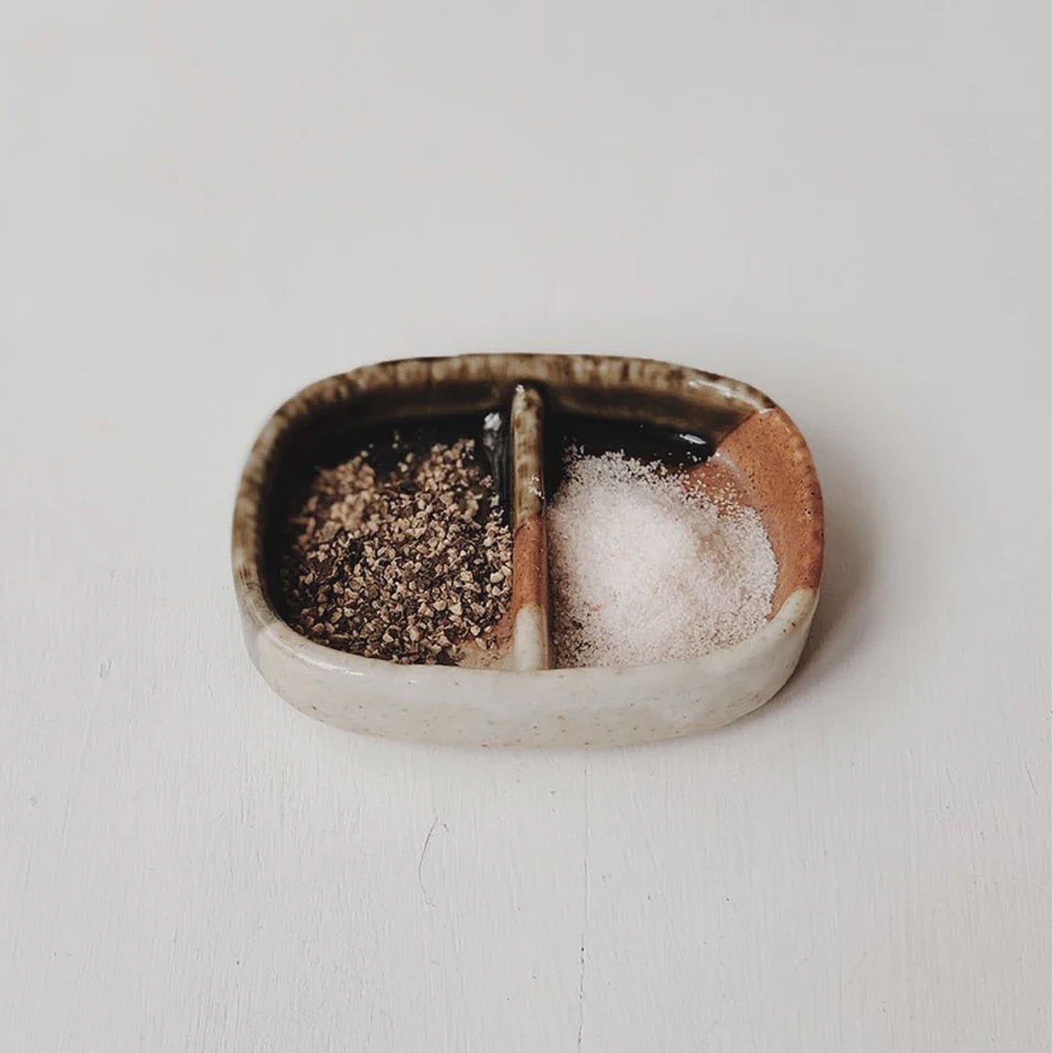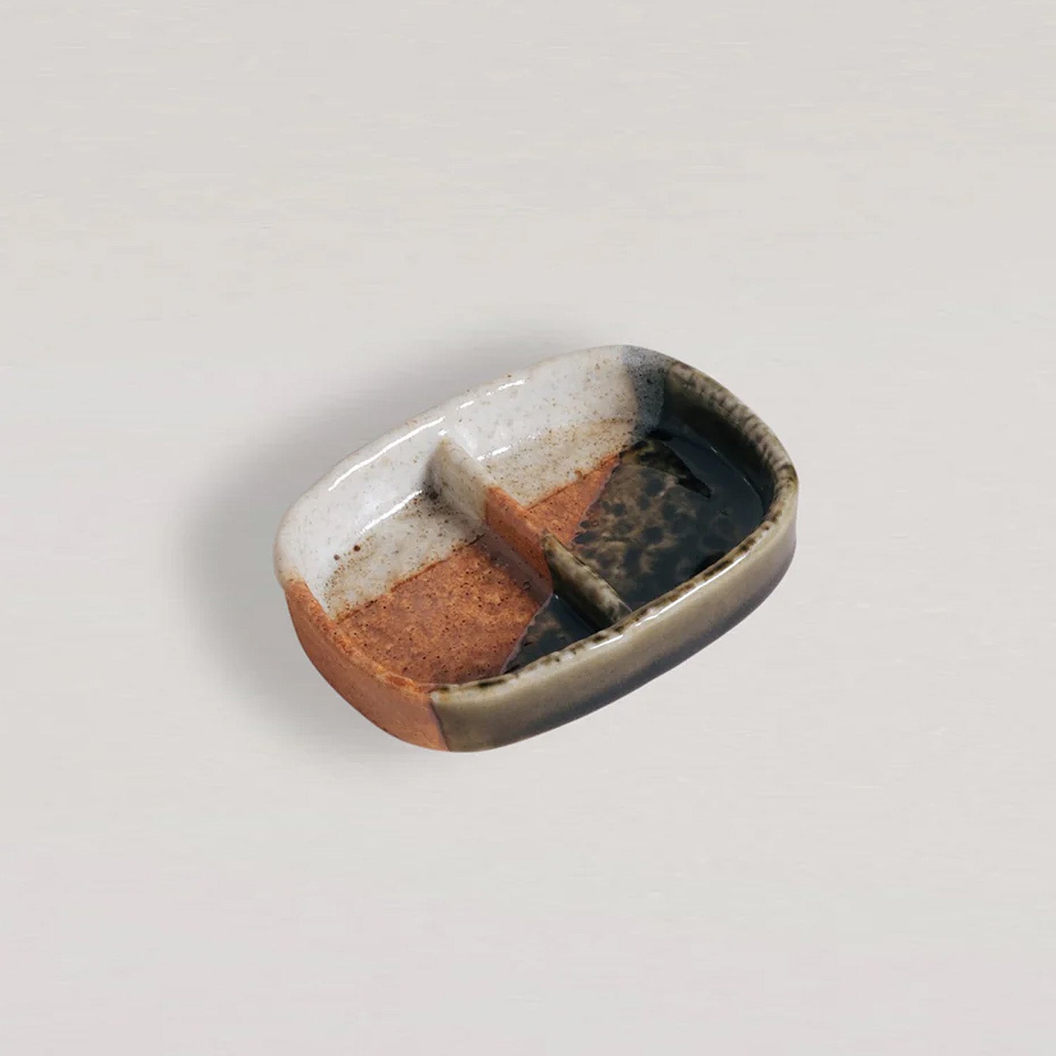 The Shio Ceramic Dish is the perfect way of dressing up your dining table. Made in Tajimi, Japan, it's separated compartments are ideal for salt and pepper or ginger and soy sauce. The earthy colouring that blends textured clay and a smooth glaze gives it a warm and homely feel.